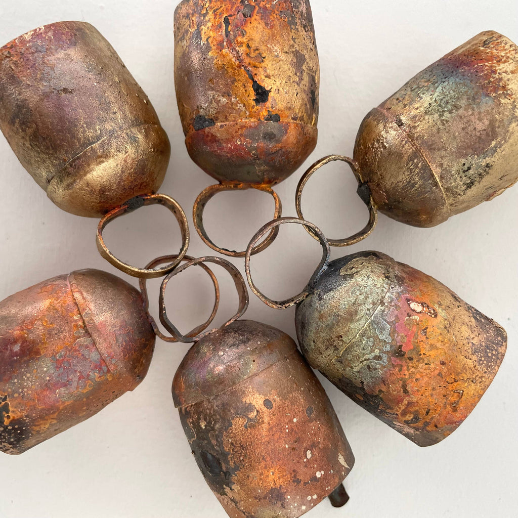 As each bell is handmade, no two bells are exactly the same. Variations are to be expected in size, shape, finish, and color. Some bells have a multi-colored or orange/red finish. Since these are made from recycled tin and hand formed, occasionally the bottom of the bell is not completely straight, the handle may be slightly mis-shaped or off-centered, or there may be small dents (see photos).