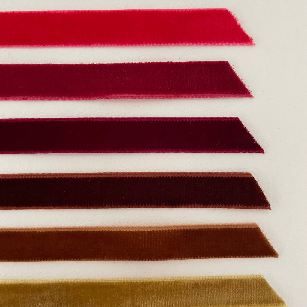 16 color-ways of 100% polyester velvet 3/8" wide ribbon made in Vietnam!