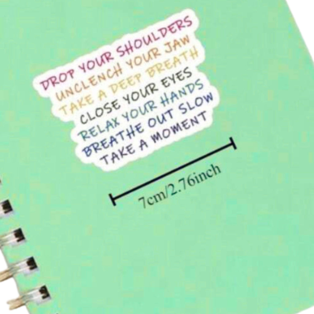 Help your customers pause and breathe with this uplifting mindfulness sticker. Featuring a rainbow-colored message to drop shoulders, unclench the jaw, and relax, it’s a perfect daily reminder for reducing stress and promoting calm. Sized at about 2.76 inches wide, this durable vinyl sticker is ideal for laptops, journals, water bottles, or workspaces. Great for boutiques, bookstores, wellness shops, and gift retailers looking to offer thoughtful, mental-health inspired items.