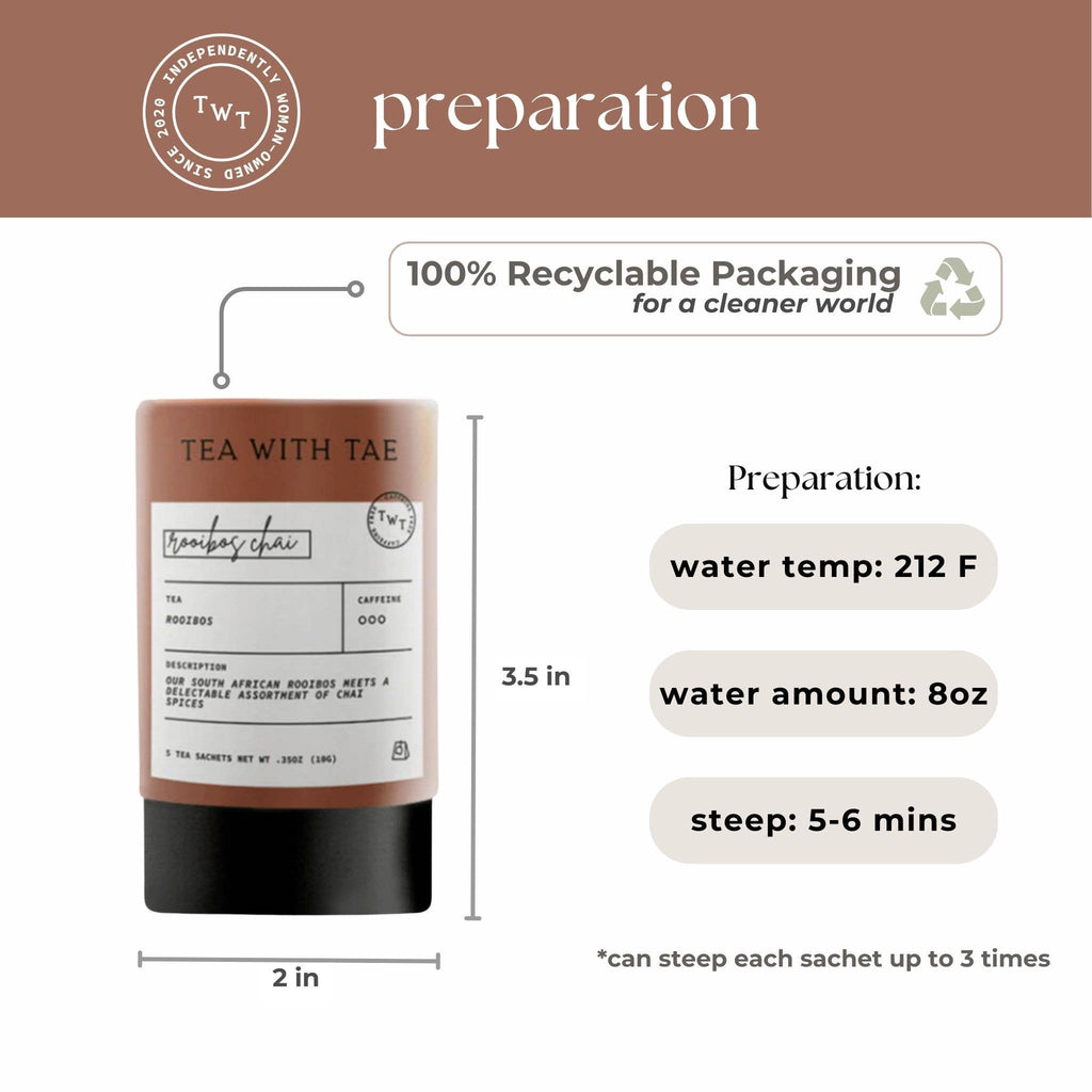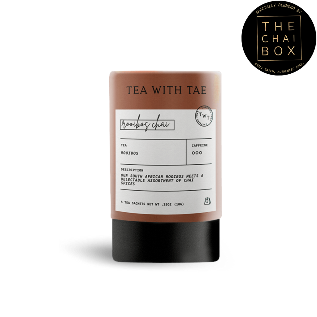 ROOIBOS CHAI (DECAF): Specially blended for TWT by The Chai Box! Our full-bodied South African Rooibos meets the delectable chai spices of cinnamon, cardamom, ginger, and cloves. The rooibos bushes are rosemary-type shrubs indigenous to a small area of the arid Western Cape, and the chai spices are traditional to India.