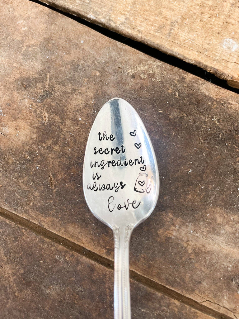 Hand stamped “the secret ingredient is always love” spoon with a mason jar and little hearts. This is for ONE spoon.